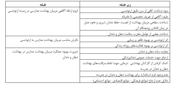 بر اساس یافتههای جدول 1 اکثریت شرکت کنندگان زن (60 درصد) و با تحصیلات کارشناسی (65 درصد) بودند. همچنین اکثریت افراد (70 درصد) تجربه ارتودنسی داشتهاند. از 20 شرکتکننده رشته 7 نفر از آن ها غیر مرتبط با بهداشت و تربیت بوده و میانگین سنی آن ها 35/5 سال و با میانگین سابقه کار آنها 10 سال بود (جدول 1). در این مطالعه مجموعاً حدود 215 کد باز از مصاحبه ها استخراج شد که پس از ادغام و همپوشانی به 68 عدد رسید که11 زیر طبقه و سه طبقه اصلی استخراج شد. طبقه اصلی «لزوم ارتقاء آگاهی مربیان بهداشت مدارسی در زمینه ارتودنسی» در برگیرنده چهار زیر طبقه« نبود شناخت کافی از سن دقیق ارتودنسی، طیف آگاهی از تعریف تخصصی تا عامیانه، شناخت سطحی مربیان بهداشت از اهمیت حفظ دندان شیری و نحوه عمل در زمان افتادن زودهنگام آن، شناخت بعضی از عوامل مخرب سلامت دهان و دندان» میباشد. طبقه اصلی «نگرش مناسب مربیان بهداشت مدارس به ارتودنسی» در برگیرنده دو زیر طبقه «بهبود در ظاهر و زیبایی»و«بهبود فعالیتهای روزانه» میباشد. همچنین طبقه اصلی« ضرورت بهبود عملکرد مربیان بهداشت مدارس در بهداشت دهان و دندان» در بردارند 5 زیر طبقه « معاینه ساده دهان و دندان»، «ارجاع جهت خدمات عمومی دندانپزشکی»، «کمک گرفتن از کارکنان بهداشتی -درمانی جهت انجام مراقبتهای بهداشت دهان و دندان در مدرسه»، «عدم وجود فرم استاندارد برای بررسی بهداشت دهان و دندان در مدرسه» و «دلایل عدم ارجاع (موانع فرهنگی موانع اقتصادی- موانع اجتماعی)» میباشد جدول 2). در زیر طبقه «نبود شناخت کافی از سن دقیق ارتودنسی» مشارکتکنندگان به مواردی از قبیل ارجاع در سنین 7تا12 سال،ارجاع قبل از رویش دندانهای دائمی، ارجاع بعد از رویش دندانهای دائمی،ارجاع در سنین بلوغ (16تا 18) و بعد از آن، زمان دبیرستان و بالاتر برای ارتودنسی مناسب است، ارتودنسی در سنین پایینتر بهتر و اثرگذارتر است، ارتودنسی در هر سنی قابل انجام است و تفاوتی ندارد چه سنی باشد، ارتودنسی باید حتماً بعد از سن خاصی و حتی در دوره بزرگسالی باشد چون در غیر این صورت برمیگردد اشاره میکنند. زیر طبقه «طیف آگاهی از تعریف تخصصی تا عامیانه» براساس اظهارت مشارکتکنندگان از قبیل ارتودنسی سیمپیچیهای دندانی است، نگینهایی که روی دندان میگذارند نوع متحرک ارتودنسی را شبها در میآورند، ارتودسی سیمهایی است که باید هر چند وقت یکبار تنظیم شوند، ارتودنسی به دو صورت ثابت و متحرک است، نوع متحرک پلاکهایی است که بعضی مواقع در دهان میگذارند، شناخت ناکافی از مراکز ارائه دهنده و متخصصین این رشته استخراج شده است در زیر طبقه «شناخت سطحی مربیان بهداشت از اهمیت حفظ دندان شیری و نحوه عمل در زمان افتادن زودهنگام آن» مشارکتکنندگان به حفظ فضا و جلوگیری از پرشدن فضا با دندانهای کناری، گذاشتن فضا نگهدار و پایه نگه دارنده اشاره می کنند و زیرطبقه «شناخت بعضی از عوامل مخرب سلامت دهان و دندان »مشارکتکنندگان اظهار میدارند مکیدن انگشت باعث کج و نامرتبی دندانها میشود، مکیدن انگشت باعث جلو آمدن فک و دندانها میشود، مکیدن انگشت اثری روی دندان ها و فک ندارد و روی لب اثر میگذارد، مکیدن انگشت بر سقف کام اثر میگذارد،مکیدن انگشت باعث داخل رفتن دندان های جلو میشود، مکیدن انگشت باعث میشود دندانها و فک به سمت جلو بیاید، مکیدن پستانک هم باعث نامرتبی دندانها میشود، تنفس دهانی هم موجب نامرتبی دندان و اثر بر فک میشود، جویدن ناخن اکثرا به خاطر استرس است و موجب نامرتبی دندانها میشود. در زیرطبقه «بهبود در ظاهر و زیبایی» مشارکتکنندگان موارد دندانهای نامرتب و کج،فک جلو و عقب، شکل نامناسب دندان، روی هم در آمدن دندانها، دندانهای عقب و جلو، فاصله بین دندانها –داشتن پشت دندانی، بیرونزدگی دندانها، دندانها زیبا نباشند، فک کوچک باشد، فک رشد کافی نکرده، برای بزرگ کردن فک بیان میدارند در زیرطبقه بهبود فعالیتهای روزانه زندگی مشارکتکنندگان: مشکل در صحبت کردن، مشکل در غذا خوردن، مشکل در نفس کشیدن بیا