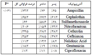جدول 4: توزیع فراوانی مقاومت آنتیبیوتیکی یافت شده در کشت ادرار کودکان مبتلا به عفونت ادراری بستری شده در بیمارستانهای تابعه دانشگاه علوم پزشکی آزاد اسلامی تهران در سالهای 1401-1400 بر اساس جنسیت