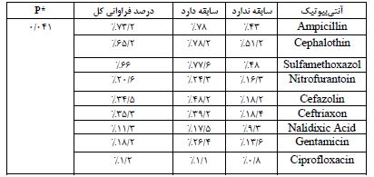 جدول 5: توزیع فراوانی مقاومت آنتیبیوتیکی یافت شده در کشت ادرار کودکان مبتلا به عفونت ادراری بستری شده در بیمارستانهای تابعه دانشگاه علوم پزشکی آزاد اسلامی تهران در سالهای 1401-1400 بر اساس سابقه عفونت