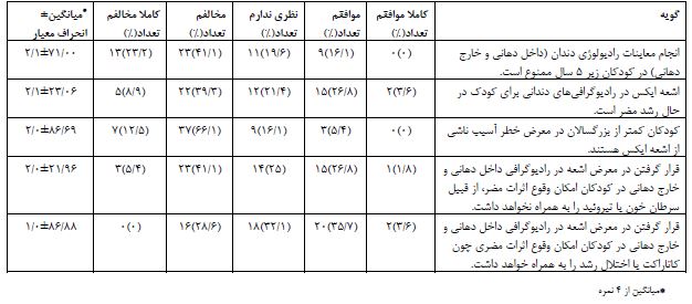 جدول2: توزیع فراوانی و میانگین نمره نگرش دانشجویان دندانپزشکی یزد نسبت به حفاظت کودکان در برابر اشعه رادیوگرافی درسال 1402