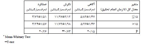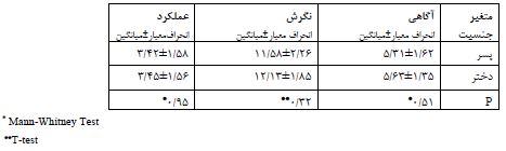 دادهها در نرمافزار آماری SPSS version 16 وارد شد. نرمالیتی دادهها با استفاده از آزمون K-S بررسی شده و با توجه به توزیع نرمال دادههای عملکرد از آزمون آماری پارامتریک T-test و به علت توزیع غیر نرمال دادههای آگاهی و نگرش از آزمونهای آماری ناپارامتریک Mann-Whitney Test ،T-test و Spearman's correlation coefficient جهت تجزیه و تحلیل دادهها استفاده شد .