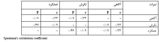 جدول6: ضریب همبستگی نمرات آگاهی، نگرش و عملکرد دانشجویان دندانپزشکی یزد نسبت به حفاظت کودکان در برابر اشعه رادیوگرافی درسال 1402