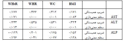 جدول 3: بررسی همبستگی بین شاخصهای پیکرسنجی و آنزیمهای کبدی در زنان و مردان شاغل