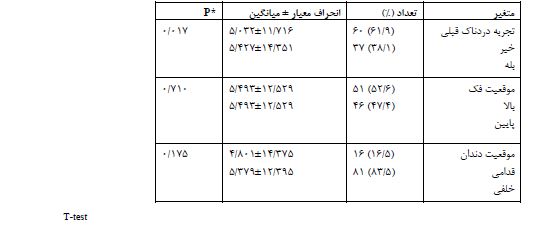 جدول2: میانگین نمره اضطراب دندانپزشکی در بیماران با پالپیت علامتدار مراجعه کننده به دانشکده دندانپزشکی یزد در سال 1402 برحسب تجربه درد، نوع فک و موقعیت دندان