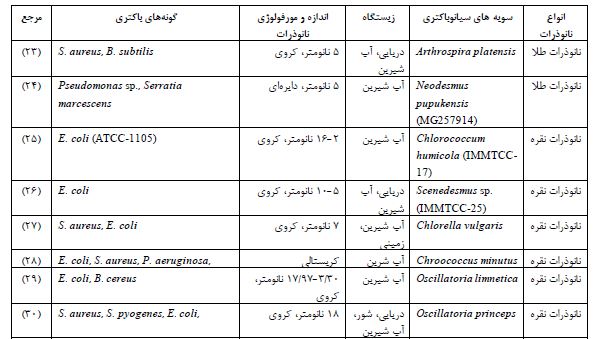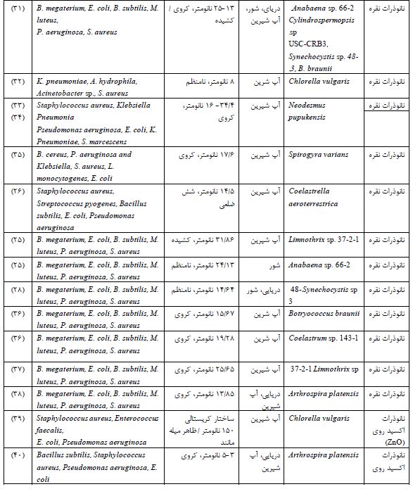 جدول 1: فعالیت ضد باکتریال نانوذرت بیوسنتز شده توسط سویههای مختلف سیانوباکتریها