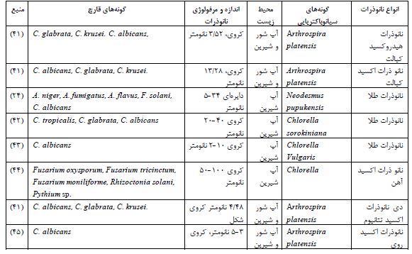 جدول 2: انواع نانوذرات ضد قارچی بیوسنتز شده توسط سیانوباکتریها