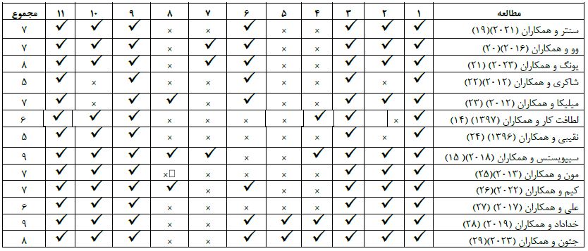 جدول ۱: کیفیت مطالعات بر اساس شاخص ۱۱ سؤالی پدرو
