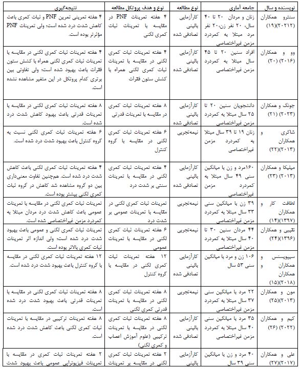 شرح نتایج مطالعات منتخب: سنتر و همکاران در سال ۲۰۲۱ به بررسی تاًثیر ۴ هفته تمرینات تسهیل عصبی عضلانی در مقایسه با تمرینات ثبات کمری لگنی بر شدت درد زنان و مردان مبتلا به کمردرد مزمن غیراختصاصی پرداختند آنها گزارش کردند تمرینات تسهیل عصبی عضلانی در مقایسه با تمرینات ثبات کمری لگنی باعث بهبود درد شده است. آنها به مدت ۳ ماه بعد مجدد شدت درد را بررسی کردند که ماندگاری تمرینات ثبات کمری لگنی باعث کاهش شده درد شده بود. وو و همکاران در سال ۲۰۱۶ به بررسی تاًثیر 4 هفته تمرینات ثبات کمری لگنی در مقایسه با تمرینات ترکیبی ثبات کمری لگنی همراه با کشش ستون فقرات پرداختند. آنها ۳۰ مرد و زن با میانگین سنی ۴۰ سال را به دو گروه تقسیم کردند. گزارش دادند هر دو تمرینات باعث بهبود شده است و تفاوتی بین دو پروتکل یافت نشد (20). جونگ و همکاران در سال ۲۰۲۳ به بررسی تاًثیر ۸ هفته تمرینات ثبات کمری لگنی در مقایسه با تمرینات قدرتی بر درد زنان مبتلا به کمردرد مزمن غیراختصاصی پرداختند، جامعه آماری آنها ۳۷ زن با میانگین سنی ۲۲ سال بود. آن¬ها گزارش کردند تمرینات ثبات کمری لگنی در مقایسه با تمرینات قدرتی باعث بهبود شدت درد شده است (21). شاکری و همکاران در سال ۲۰۱۳ به بررسی تاًثیر 6 هفته تمرینات ثبات کمری لگنی در مقایسه با گروه کنترل پرداختند. ۳۰ زن مبتلا به کمردرد مزمن غیراختصاصی با میانگین سنی ۳۱ سال پرداختند، آنها گزارش کردند تمرینات ثبات کمری لگنی در مقایسه با گروه کنترل باعث بهبود شدت درد شده است (22). میلیکا و همکاران در سال ۲۰۱۲ به بررسی تاًثیر تمرینات ثبات کمری لگنی در مقایسه با تمرینات سنتی پرداختند، جامعه آماری آنها 160 مرد و زن با میانگین سنی 49 سال بودند، نتایج نشان داد تمرینات ثبات کمری لگنی باعث بهبود شدت میشود (23). لطافت کار و همکاران در سال ۱۳۹۷ به بررسی تاًثیر تمرینات منتخب ثبات کمری لگنی در مقایسه با تمرینات عمومی پرداختند. جامعه آماری آنها 39 زن با میانگین سنی 33 مبتلا به کمردرد مزمن غیراختصاصی بودند. نتایج نشان داد فقط تمرینات منتخب ثبات کمری باعث کاهش شدت درد شده است (14). نقیبی و همکاران در سال 1396 به بررسی تاًثیر تمرینات عمومی در مقایسه با تمرینات منتخب کمری لگنی پرداختند. جامعه آماری آنها 44 مرد با میانگین سنی ۳۵ سال بودند، آنها گزارش کردند هر دو تمرین باعث کاهش شدت درد میشود؛ ولی تمرینات ثبات کمری لگنی اثربخشی بالاتری داشته است (24). سیپویسنس و همکاران در سال 2018 به بررسی 12 هفته تمرینات ثبات کمری لگنی در مقایسه با گروه کنترل بر شدت درد پرداختند. آنها 106 زن و مرد مبتلا به کمردرد مزمن غیراختصاصی پرداختند، همچنین آنها پیگیری یک ماه انجام دادند. نتایج نشان داد تمرینات ثبات کمری لگنی باعث بهبود درد میشود و اثر این تمرینات ماندگار است (15). مون و همکاران در سال 2013 به بررسی تاًثیر تمرینات ثبات کمری لگنی در مقایسه با تمرینات قدرتی کمری لگنی پرداختند، جامعه آماری آنها 22 نفر با میانگین سنی 38 سال بودند. نتایج نشان داد تمرینات ثبات کمری لگنی در مقایسه با تمرینات قدرتی کمری لگنی باعث بهبود شدت درد میشود (25). کیم و همکاران در سال 2022 به بررسی تاًثیر تمرینات ثبات کمری لگنی در مقایسه با تمرینات ترکیبی کمری لگنی در مقایسه با علوم آموزش درد پرداختند. جامعه آماری 35 مرد مبتلا به کمردرد مزمن غیراختصاصی پرداخت، نتایج نشان داد تمرینات ترکیبی در کاهش شدت درد مؤثرتر است تمرینات ثبات کمری لگنی است (26). علی و همکاران در سال 2016 به بررسی تاًثیر تمرینات ثبات کمری لگنی در مقایسه با تمرینات فیزیوتراپی عمومی پرداختند، جامعه آماری آن¬ها 40 مرد و زن با میانگین سنی 39 سال بودند نتایج نشان داد تمرینات ثبات کمری لگنی در مقایسه با تمرینات عمومی باعث کاهش شدت درد شده است (27). خداداد و همکاران در سال 2019 به بررسی تاًثیر تمرینات ثبات کمری لگنی در مقایسه با تمرینات شناختی عملکردی پرداختند، جامعه آماری آنها 54 فرد میانگی سنی 53 سال بود نتایج نشان داد تمرینات ثب