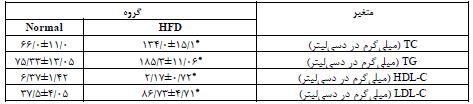 گروه رژیم غذایی پرچرب HFD، گروه شاهد Normal، کلسترول تام TC، تری گلیسیرید TG ، لیپوپروتئین با چگالی بالا HDL-C و لیپوپروتئین با چگالی کم LDL-C