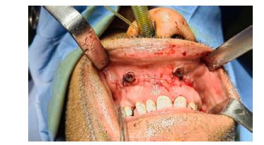 شکل8: نمای داخل دهانی حین جراحی مارسوپیالیزاسیون در ناحیه قدامی ماگزیلا. دو پنجره در دیواره ضایعه ایجاد شده و توسط بخیه به مخاط دهان متصل شدهاند. پانسمان داخل حفره پس از عمل انجام شده است.
