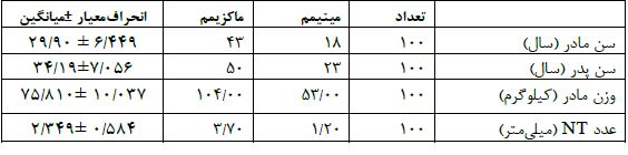 نتایج تحلیل آمار ارتباط بین متغیرها: از اهداف این مطالعه بررسی ارتباط بین عدد NTجنین با وزن مادران باردار و سن پدر و مادر بوده است. برای این هدف از آزمون آماری پیرسون استفاده شد. نتایج این آزمون آماری در جدول ۲ ارائه شده است. براساس نتایج این جدول ارتباط معناداری بین متغیر NT جنین با وزن مادران، سن مادران و پدران مشاهده نشد (P˃0.05).