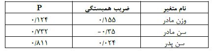 جدول ۲: نتایج تحلیل آماری پیرسون برای بررسی رابطه میان NT با وزن مادران و سن مادران و پدران جنینهای دارای کانونهای اکوژنیک داخل قلب