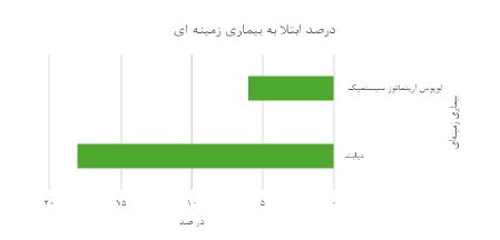 یافتههای توصیفی دادگان: توصیف دادههای در این مطالعه با استفاده از شاخصهای تمایل مرکزی (میانگین) و پراکندگی متغیرهای کمی (انحراف معیار) انجام شده است و برای توصیف دادگان گسسته از درصد فراوانی استفاده شده است. با بررسیهای صورت گرفته میانگین سن مادر6/449 ± 29/90 سال و سن پدر 7/056±34/19 سال بوده است. میانگین وزن براساس اطلاعات آماری جاصل از بررسی میزان فراوانی موارد ابتلا به لوپوس اریتماتوز سیستمیک و دیابت در مادران مورد بررسی به ترتیب ۶٪ و دیابت ۱۸٪ بوده است. شکل ۱ میزان فراوانی بیماریهای زمینهای را نشان میدهد.